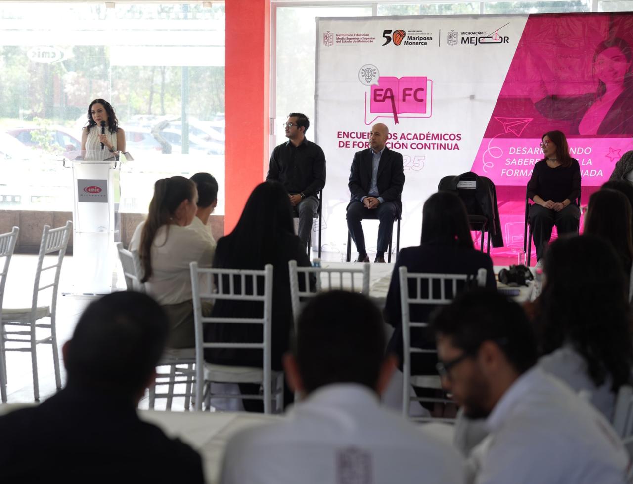 Morelia, Michoacán, 7 de octubre de 2025.- Para fortalecer la actualización y formación continua de las y los docentes de bachillerato, el Instituto de Educación Media Superior y Superior del Estado de Michoacán (Iemsysem) llevó a cabo el cuarto Encuentro Académico de Formación Continua para Líderes Académicos 2025.