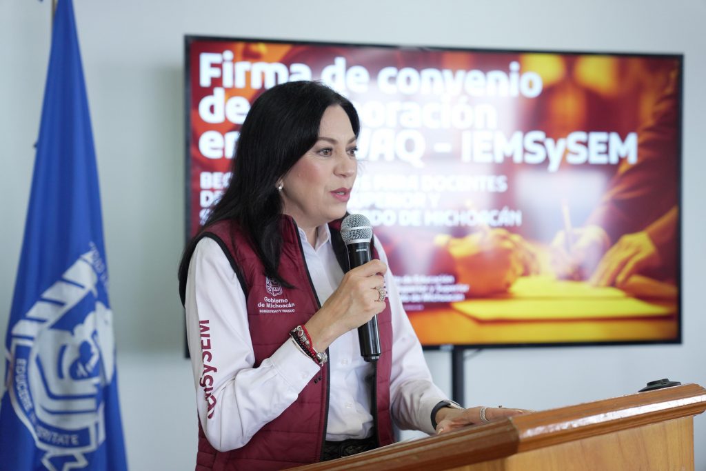 Morelia, Michoacán, 3 de septiembre de 2025.- Con el objetivo de fortalecer la preparación académica de las y los maestros de Michoacán, el Instituto de Educación Media Superior y Superior del Estado (Iemsysem) y la Universidad Vasco de Quiroga (Uvaq) ofrecerán becas del 50 por ciento para la formación de docentes de ambos niveles educativos.