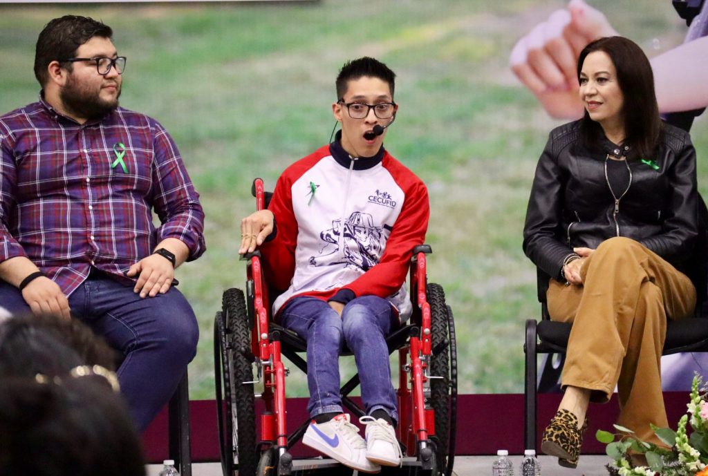 Morelia, Michoacán, 8 de noviembre de 2023.- Destacados en el deporte, la cultura y el emprendimiento, los jóvenes michoacanos Lupita, Erik y Gerardo, compartieron parte de su historia de vida a estudiantes del Instituto Tecnológico de Morelia, durante el conversatorio Desafíos, logros y retos de las personas con parálisis cerebral.