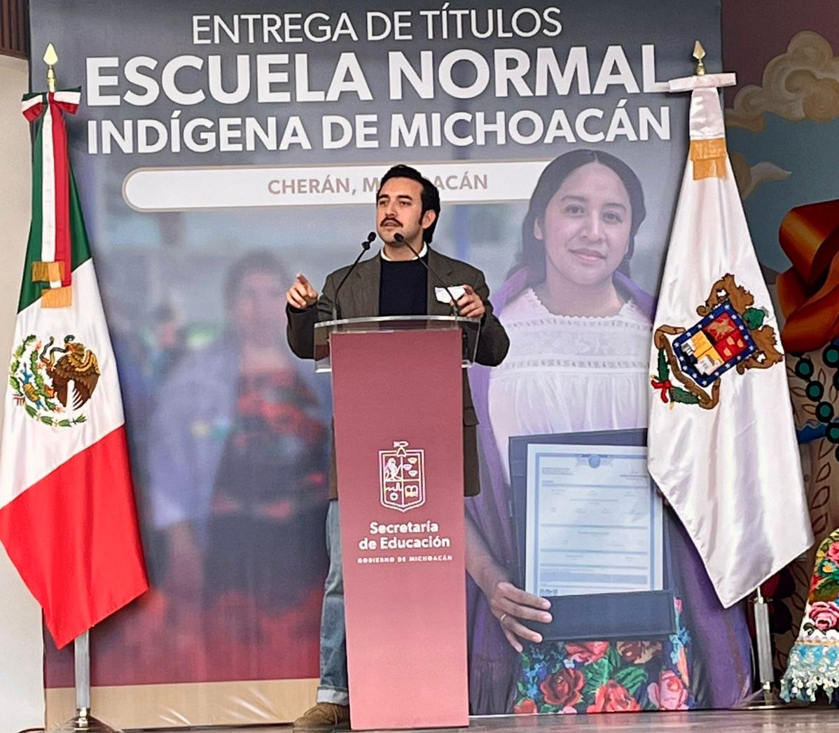 Cherán, Michoacán, 3 de marzo de 2026.- Con la entrega de más de 700 títulos profesionales a egresadas y egresados de la Escuela Normal Indígena de Michoacán, el Gobierno del Estado salda una deuda histórica con más de 10 generaciones de docentes, al garantizarles el reconocimiento académico oficial que legítimamente les corresponde, informó el Instituto de Educación Media Superior y Superior del Estado (Iemsysem).